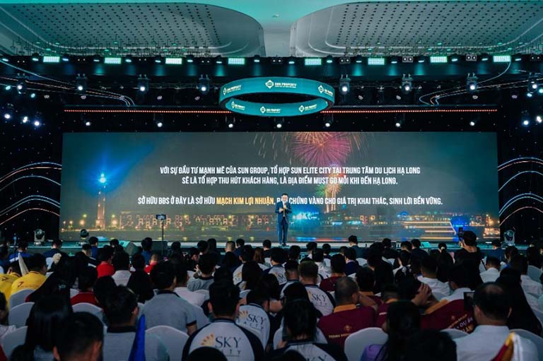 Tâm điểm làm rung chuyển hội trường chính là màn “vén màn” Sun Elite City, với những thông tin chi tiết về quy hoạch, vị trí kim cương và tiềm năng sinh lời đột phá. Khí thế được đẩy lên đỉnh điểm với nghi thức kick-off: Hàng nghìn chuyên viên kinh doanh đồng loạt lao lên, hô vang khẩu hiệu như một lời tuyên thệ, thể hiện quyết tâm bứt phá mọi giới hạn để chinh phục thị trường.